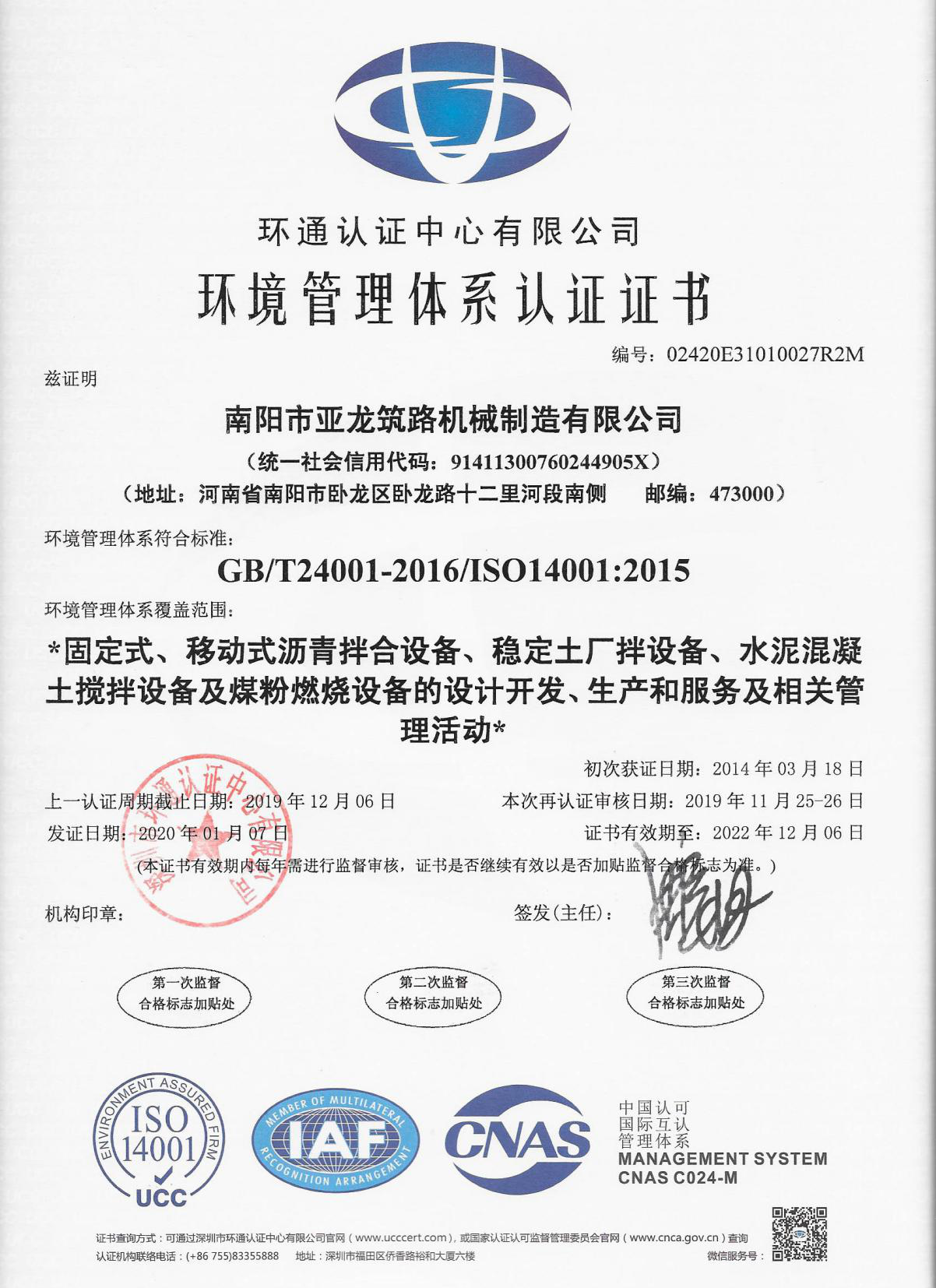 環(huán)境管理體系證書