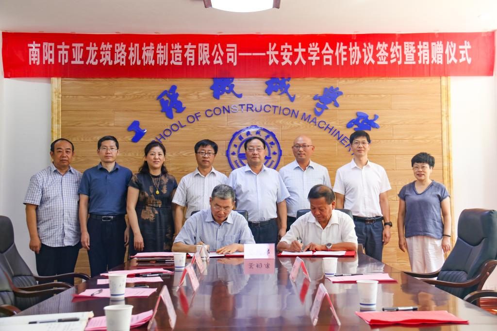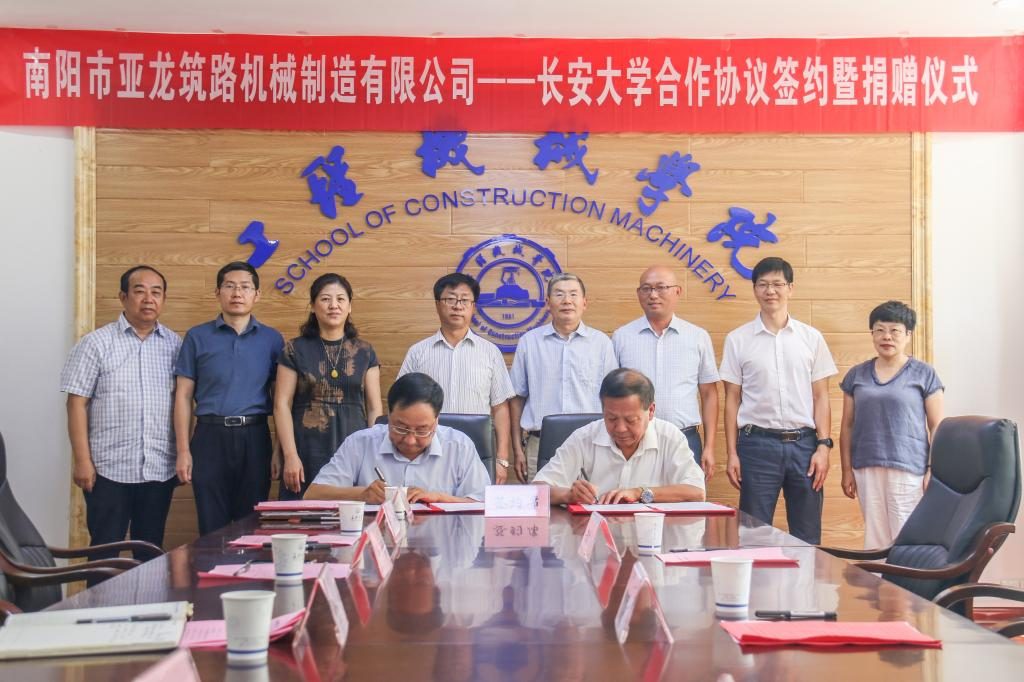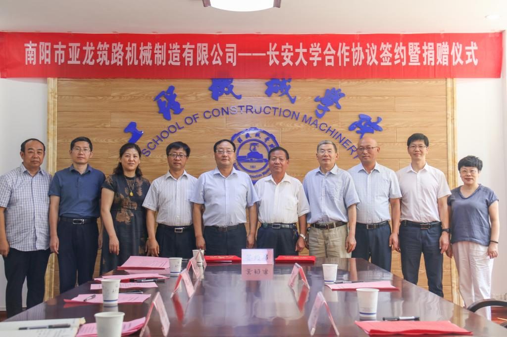 2020年9月3日下午,南陽市亞龍筑路機(jī)械制造有限公司——長(zhǎng)安大學(xué)合作協(xié)議簽約暨捐贈(zèng)儀式在工程機(jī)械學(xué)院211會(huì)議室舉行。南陽市亞龍筑路機(jī)械制造有限公司董事長(zhǎng)王志興、副總經(jīng)理張大禹、總工程師沈元林,長(zhǎng)安大學(xué)黨委副書記徐引正,長(zhǎng)安大學(xué)教育基金會(huì)理事長(zhǎng)、社會(huì)合作處處長(zhǎng)鄧云潮,工程機(jī)械學(xué)院黨委書記于麗娟、院長(zhǎng)胡永彪出席簽約儀式。會(huì)議由胡永彪主持。